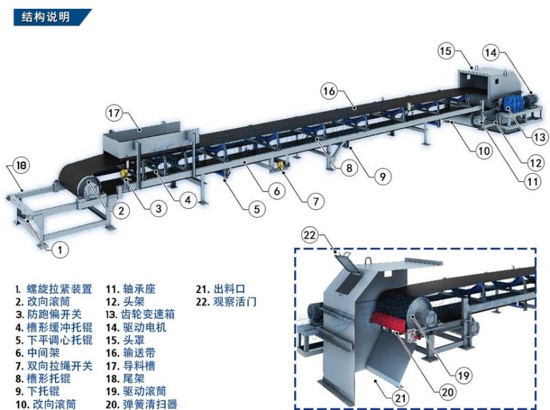 TD75型带式输送机适用于水平或倾斜输送,在工作环境为-15℃至+40℃之间,输送具有酸性碱性、油类物质和有机溶剂等成份的物料时,需采用耐油、耐酸碱的橡胶带;TD75型带式输送机驱动部分采用电机减速机或电动滚筒两种驱动;制动装置选用滚柱逆止器,带式逆止器、制动器等;拉紧形式有螺旋拉紧、垂直拉紧、车式拉紧三种;