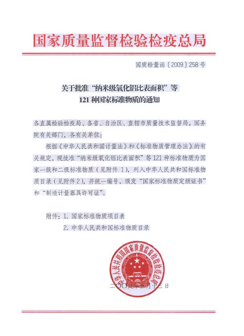 近日,国家质量监督检验检疫总局发布了《关于批准“纳米级氧化铝比表面积”等121种国家标准物质的通知》,其中,国家纳米科学中心研制的“纳米级氧化铝比表面积标准物质”被批准为国家二级标准物质,列入中华人民共和国标准物质目录。纳米氧化铝比表面积标准物质的标准值为446.6m2/g,不确定度为8.4 m2/g。这是我国首次使用纳米材料研制的比表面积标准物质,填补了国内外高比表面积标准物质研制方面的空白、br />