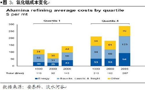 变革后的氧化铝的定价模式价格一是要反映供需面,二是反映成本的变化。从该图可以看出,氧化铝的价格主要受矾土矿、能源等原材料价格的影响,不同时间段差别较大。但目前的长协定价跟随三月期铝价格,而三月期铝价格反映的是电解铝的供求关系及投资者对于未来市场趋势的预期,与氧化铝的成本关系很小。当电解铝行业产能过剩,发生阶段性大幅下挫时,氧化铝价格的下跌在所难免,这就会损害到氧化铝供应商的利益,也是他们提出定价模式改革的原因、br />