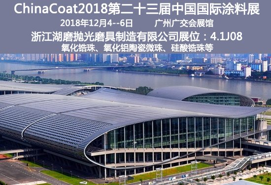 ChinaCoat2018第二十三届中国国际涂料展将移师广州,定于2018?2?--6日在广州广交会展馆举行。浙江湖磨抛光磨具制造有限公司携氧化锆珠、氧化铝陶瓷微珠、硅酸锆珠等亮相,期待与您相?span style="font-size: 16px; font-family: 微软雅黑, 'Microsoft YaHei'; color: rgb(255, 0, 0);">湖磨展台4.1J08、/span>