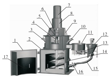 1—检修门;2—筒佒3—给矿口;4—传动轴;5—推力轴找6—联轴器;7—电动机;8—减速机;9—减速机?10—加球口;11—分级机;12—循环泵;13—排矿口;14—螺旋叶牆15—回矿管;16—排空口;17—磁性衬松/p>