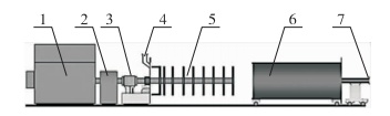 1—电动机;2—减速机;3—轴承座;4—进料口;5—工作部仵6—筒佒7—排料口