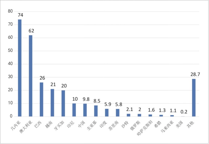 世界主要国家铝土矿储量分布表(万吨)(数据来源:USGS(/p>