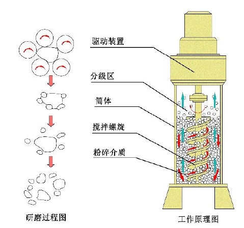 在进入九十年代之后,瑞典的Sara公司为了进一步提高研磨效率,制造出了大搅拌轴直径以及大搅拌棒数量的搅拌磨机。当前在行业中被广泛应用的立式搅拌磨机是塔磨机,塔磨机主要是利用钢材料制成的螺旋形搅拌器旋转带动物料的转动,物料从塔磨机的底部输入,在研磨腔内经过磨介的碰撞后从塔磨机顶部排出,从而实现磨矿。塔磨机一般应用于目标粒径?0~30微米的研磨条件下、br/>