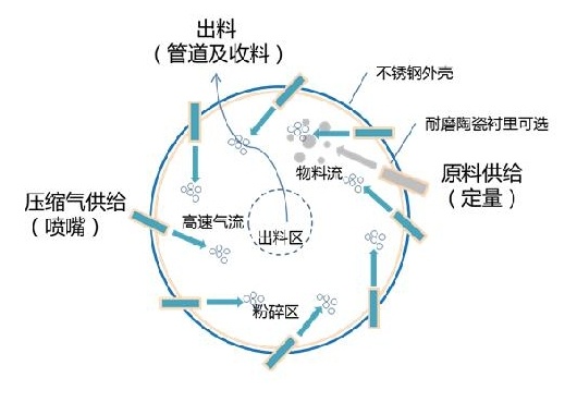 预处理后的高压工作介质(空气、氮气等)通过沿切向布置的粉碎喷嘴的特定结构后产生高速气流,原料通过气送进入粉碎腔,物料受到气流加速互相碰撞并且与中圈摩擦剪切,不断粉碎细化的物料逐渐脱离离心力,从机腔上盖的出料口内被送出粉碎腔,通过管道进入后道收尘设备(旋风分离器、布袋除尘器等) 、/p>