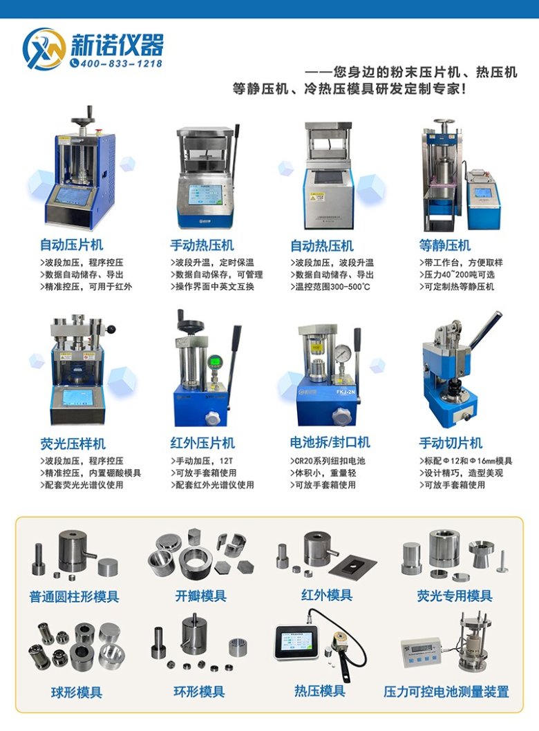 新诺仪器专注于粉末成型领域的产品研发、生产和制造,主营粉末压片机、热压机、等静压机、红外荧光光谱仪配套设备及冷热压模具的研发定制,随着公司实力和品牌影响力的不断提升,粒度仪、电池等新材料研发相关设备也不断问世、/span>