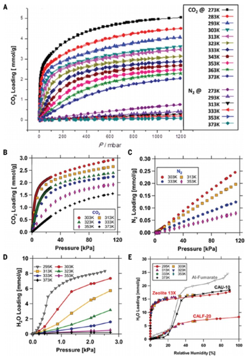 采用 Micromeritics ASAP 2020 吸附仪(?)表征发 CALF-20 比表面积?28m2/g, CO2 吸附高达4.07mmol/g (1.2bar,293K),其 CO2 的吸附选择远高于N2(如? A)。图2(E)的等温水吸附线显示,与分子筛(沸石13X)以及其他两类耐水 MOFs 相比 CALF-20 具有较高的耐水性、/span>