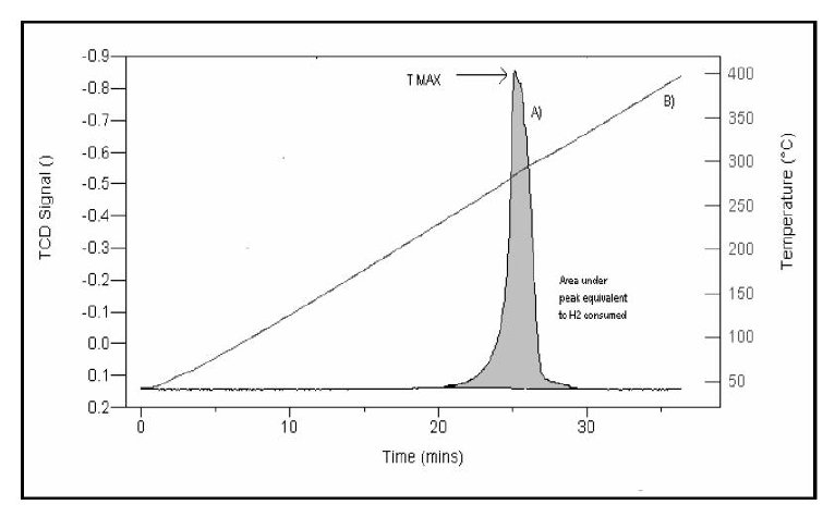? MxOy + yH2 ?nbsp;xM + yH2O 这一反应的TPR图。其中MxOy表示金属氧化物,图中峰值处Tmax代表还原速率达到最大时的温度、/span>