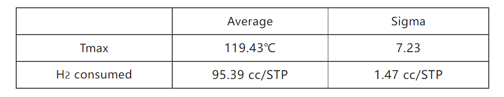 分别使用两台AutoChem化学吸附仪对上述氧化银进行总计36次TPR测试,所得的平均Tmax和H2消耗量统计结果如下表: