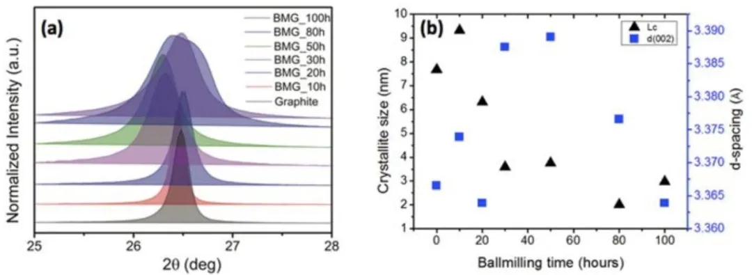 '/span>a 从球磨石墨中获得皃/span>XRD曲线 '/span>b)球磨石墨颗粒中晶粒尺寸和晶面间距的变化