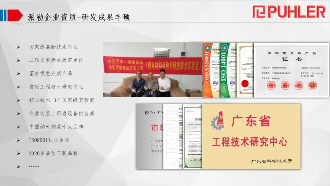 派勒集团旗下子公司“广东派勒智能纳米科技股份有限公司”(简称:派勒智能)创立于2007?月,公司总部位于广州市番禺区。派勒智能作为国内“装配式新能源材料研磨系统解决方案先行者? 公司?015年开始转型升级和产品迭代升级。主要从事锂电池正负极材料输送、计量配混、纳米研磨、气流粉碎系统及锂离子电池(LIB)电极浆料匀浆分散系统等智能装备的高新技术企业,已实现专业核心设备的自主生产和全系统产品线的进口替代。将单一设备集成模式升级为模块化集成装配,极大地缩短生产、安装、调试周期。此外,公司智能化单体设备在新材料、有色金属矿、非金属矿、制药、油漆、精细化工等不同材料领域也有广泛应用、/span>