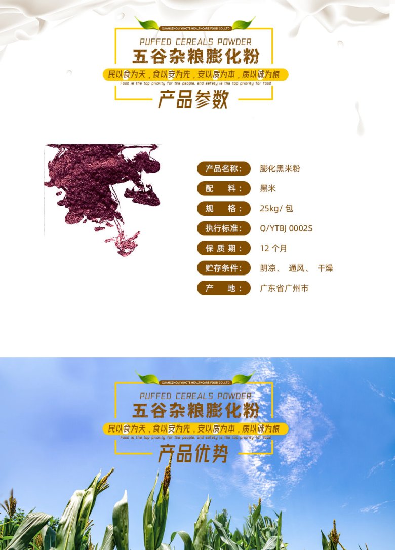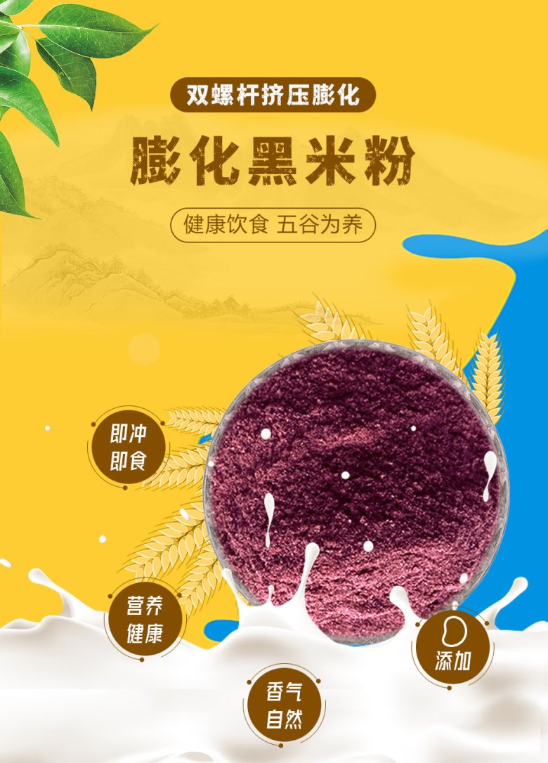 以精选优质的黑米为原斘/span>+/span>绎/span>双螺杆挤压膨化瞬时熟化,再粉碎而成的具月/span>膨化黑米香味?/span>口感润滑、水溶性好皃/span>均匀粉状产品。产品生产过程中均未使用其他物质进行调色、调馘/span>戕/span>调性状,保持产品本身的香味和特性。可根据需求定制目数、水分及微生物指标要求,也可以根据产品的需求,辅以其他谷物或药食同源的食品原料,按合适的比例制成混合膨化粉、/span>