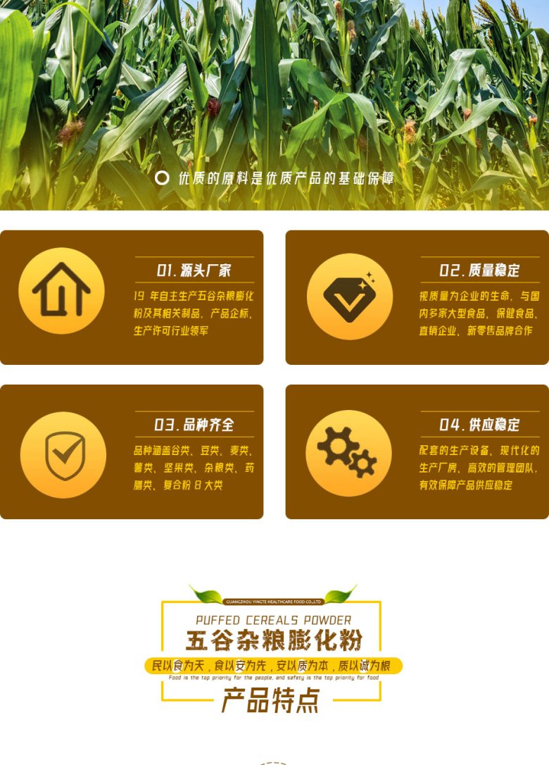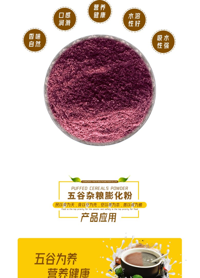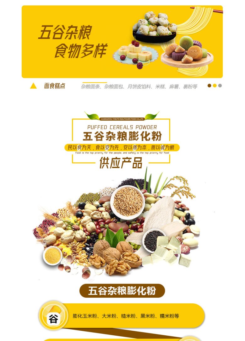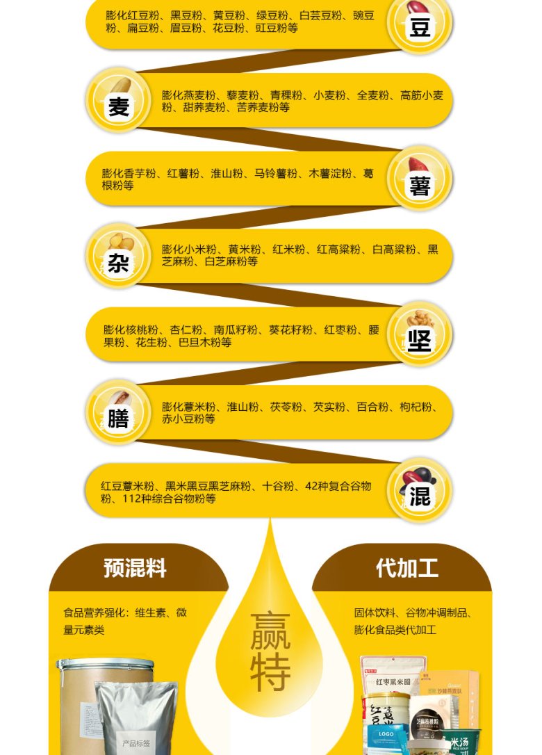 品种齐全:粮食膨化粉类包括:谷类、豆类、麦类、薯类、杂粮类、坚果类、药膳类?/span>及配方混合粉类,品种多样,可定制生产、/span>