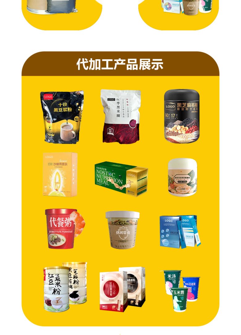 固体饮料、方便食品、膨化食品类代加工。如:十谷豆浆粉、葛仙米营养餐粉?/span>168代餐粉、营养强化燕麦粉、胶原蛋白肽、黑芝麻核桃粉、红豆薏米粉、桂花奇亚籽坚果藕粉、沙棘燕麦肽、益生菌(活性)、红枣黑米圈等、/span>