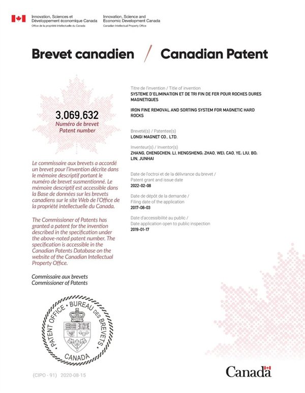 2021年,该设备获得澳大利亚专利,此次再获加拿大专利授权,隆基顽石除铁系统国际化之路越走越宽、/p>