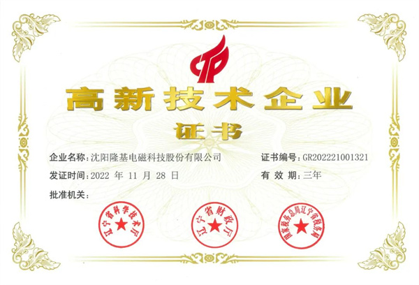 近日,隆基电磁再次获得由辽宁省科学技术厅、辽宁省财政厅和国家税务总局辽宁省税务局联合颁发的高新技术企业证书、/p>