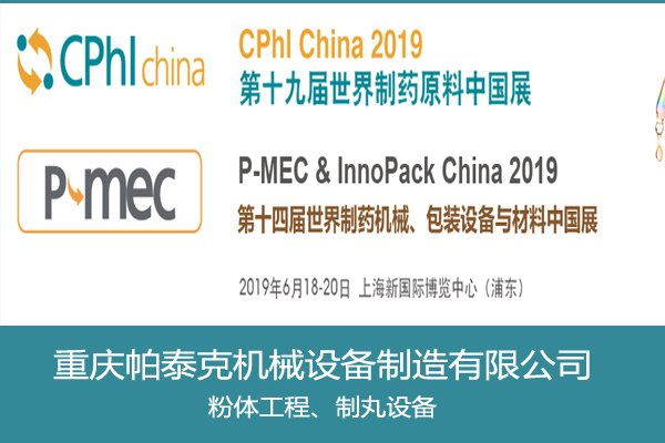 2019第十九届世界制药原料中国展暨第十四届世界制药机械、包装设备与材料中国展将?019??8-20日在上海浦东新国际博览中心举行,重庆帕泰克机械设备制造有限公司将亮相展会,展位号:N2H02,欢迎关注、届时莅临交流!