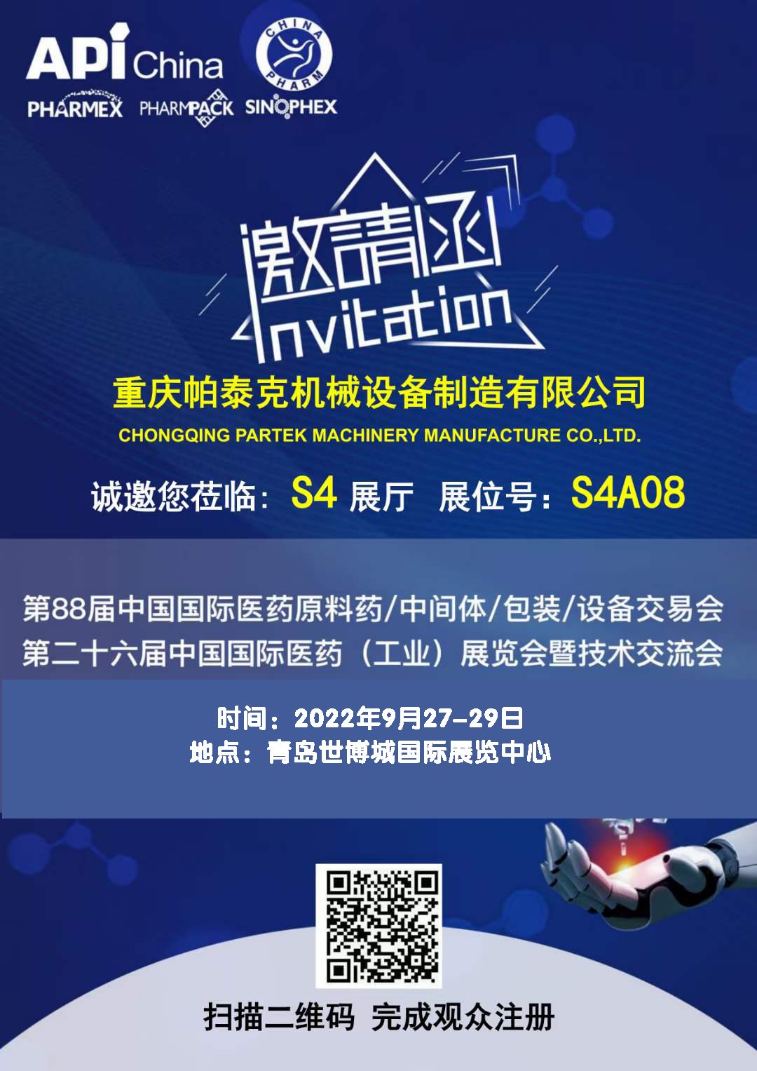 ?8届中国国际医药原料药/中间?包装/设备交易会(API China)及第二十六届中国国际医药(工业)展览会暨技术交流会(CHINA-PHARM(/span>亍/span>2022??7-29日,在山?青岛世博城国际展览中忂/span>举办、/span>制剂,粉体工程专?-重庆帕泰克机?/strong>将盛装亮相、/span>