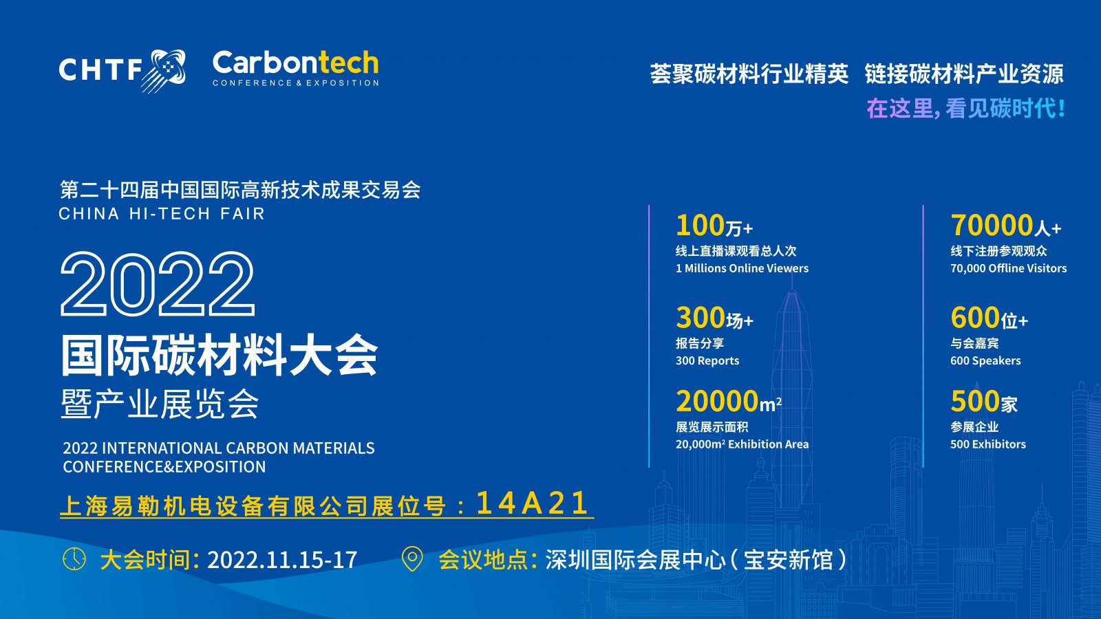 Carbontech 2022第六届国际碳材料大会暨产业展览会,将亍/span>2022?1?6-18日移师深圳国际会展中心(宝安新馆)举办,展出面积20000平方米。上海易勒机电设备有限公司应邀参展,竭诚欢迎各界人士莅临易勒机电展位交流、/span>