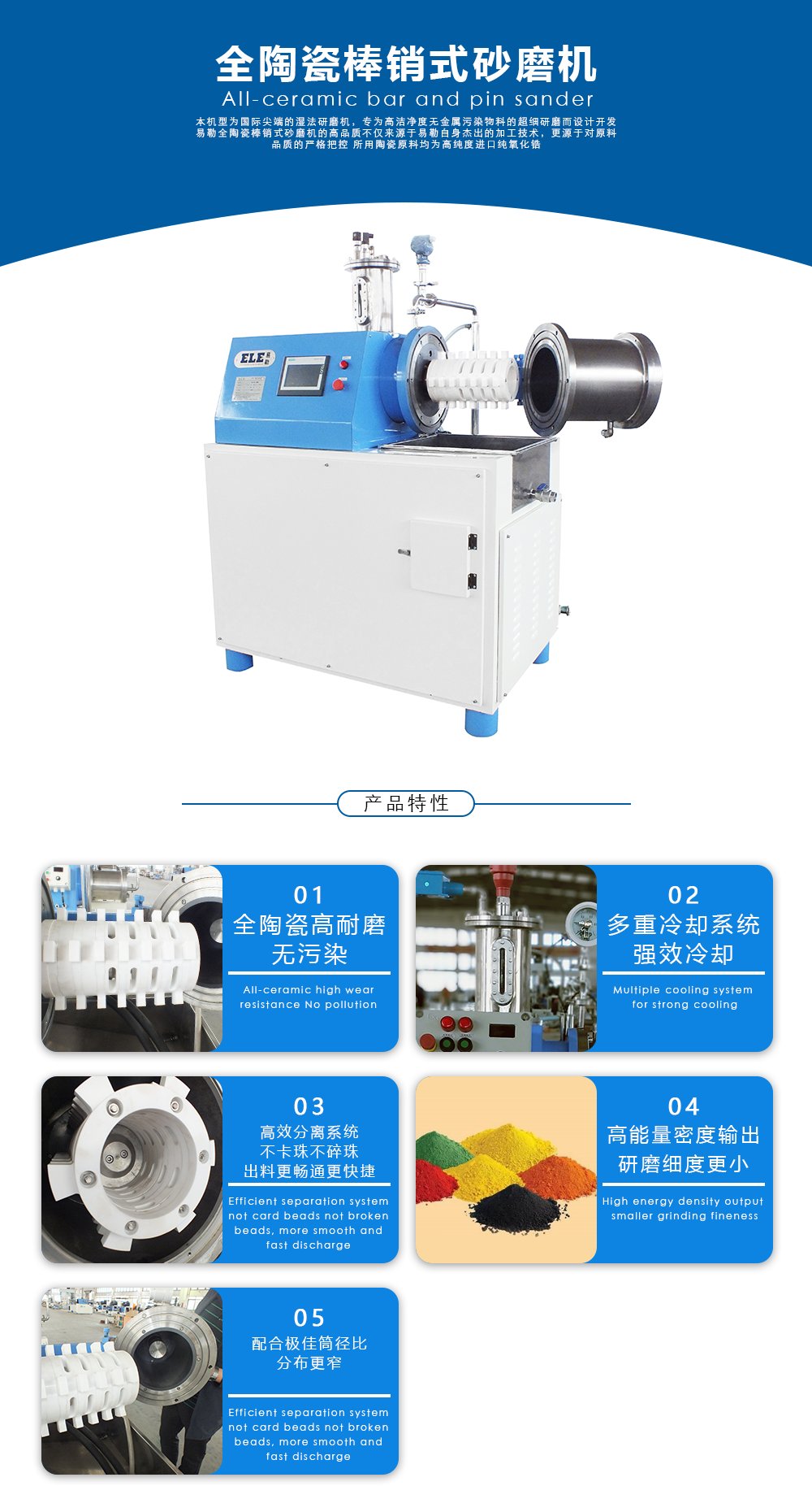 本机型为国际尖端的湿法研磨机,专为高洁净度无金属污染物料的超细研磨而设计开发易勒全陶瓷棒销式砂磨机的高品质不仅来源于易勒自身杰出的加工技术,更源于对原料品质的严格把?/span>,所用陶瓷原料均为高纯度进口纯氧化锆、/span>