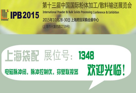 IPB 2015第十三届中国国际粉体加工/散料输送展览会将于2015?0?8-30日在上海跨国采购会展中心举行,有200多家业内知名企业共襄盛会。袋式除尘配件专?-上海袋配公司应邀参展,展位号?348。这是上海袋配第二次参加上海粉体展,届时袋配公司将现场展示电磁脉冲阀、清灰控制仪、滤袋、滤袋框架、专用配件、电气控制柜及过滤筒等系列产品、/span>