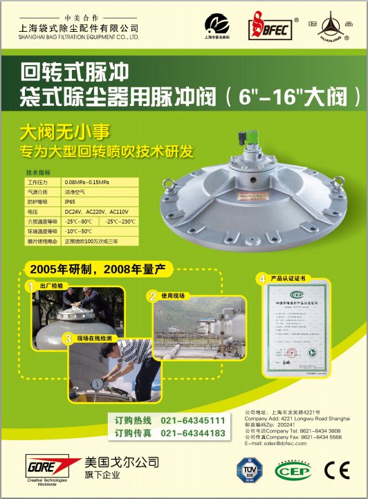 上海袋式除尘配件有限公司是国内生产袋式除尘器配件品种最为齐全、质量最为优异的企业。拥有年?0万只电磁脉冲阀生产线?0万只滤袋缝纫专用设备和年?万台清灰控制仪生产线。产品广泛应用于钢铁冶金、有色冶炼、建筑水泥、化工、工业电站锅炉以及城市垃圾焚烧等行业中的粉尘治理和烟气净化,批量出口美国、欧洲、日本及东南亚等地区,在国内外市场享有很高的声誉和知名度。