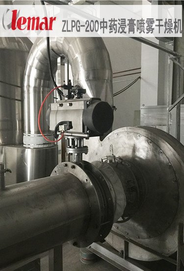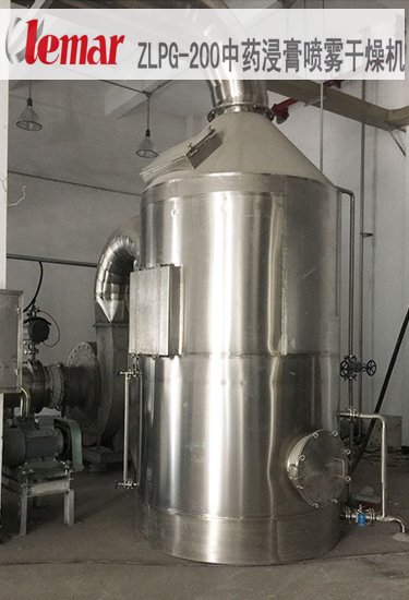 ZLPG-200中药浸膏喷雾干燥塔,该塔内外壁及管道均采用了SUS304食品级不锈钢材质,选用了LPG-300型高速离心雾化器 雾化盘直径为0.15m,转速为15500r/min、/span>
