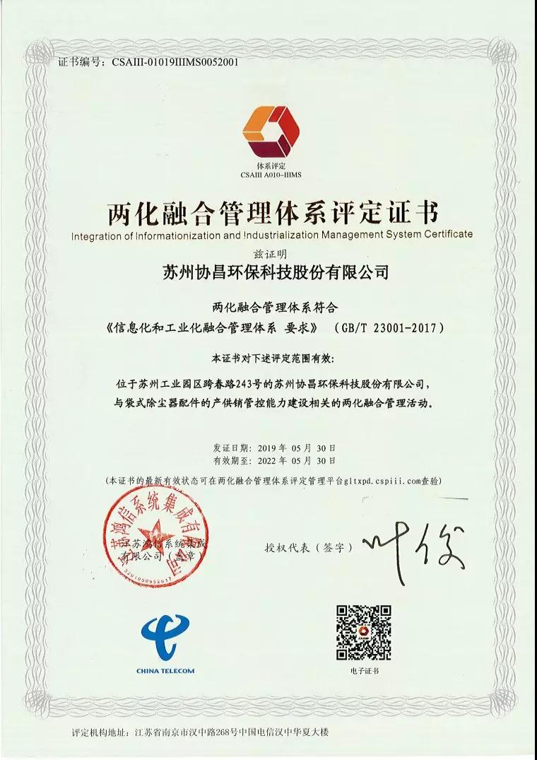 此次获国家工信部颁发两化融合管理体系评定证书,将进一步激励苏州协昌环保继续大力推进两化融合和创新发展战略,内强管理、外拓市场、创新驱动、提质增效,不断提升企业综合竞争力和经营效益,为企业和行业发展进步将起到更大的促进作用、/span>