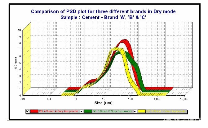 上面是三个水泥样品通过麦奇克S3500的Turbotrac测量的比较图。A和C品牌很相似,但B品牌的分布却不同。B品牌含有一部分是大?5um粗颗粒、/span>