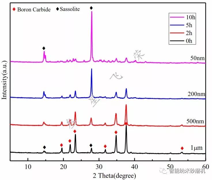 由图5与图6可知:研磨时间越长,颗粒越细,碳化硼的特征峰逐渐减弱,硼酸特征峰逐渐增强,说明在水基研磨体系中存在以下反应,而且颗粒越细,活性越强,水解反应越明显: