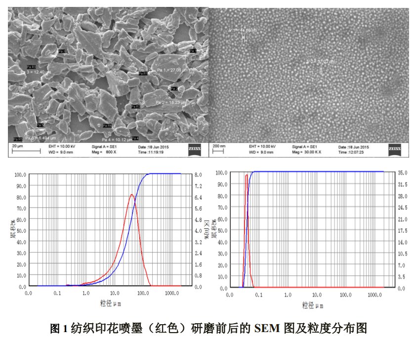 数字化喷墨墨水制备的关键是墨水的超细化加工技?/span>及其在纤维或薄膜上的固色技术、/span>这是因为喷墨喷嘴的直径小,墨水颗粒大,容易堵塞喷嘴;印制在纤维或薄膜上的墨水必须具有足够的耐水洗、耐摩擦牢度,这就要求墨水中的色料颗粒超细、颗粒分布均匀而且分散性良好、/span>