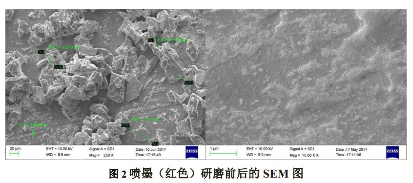 国/span>1和表1丹/span>广东某客户提供的红色纺织印花喷墨进行超细研磨,研磨前后的颗粒形貌及粒度变化情况、/span>国/span>2和表2为山东某公司提供的红色水性喷墨进行超细研磨,研磨前后的颗粒形貌及粒度分布、/span>可以看出:两组原料颗粒粗而且形状皆不规则,粒径分布较宽,超细研磨后的物料颗粒达到纳米级,球形度非常好,而且粒径分布极窄,分散性好,满足了数字喷墨墨水的要求、/span>