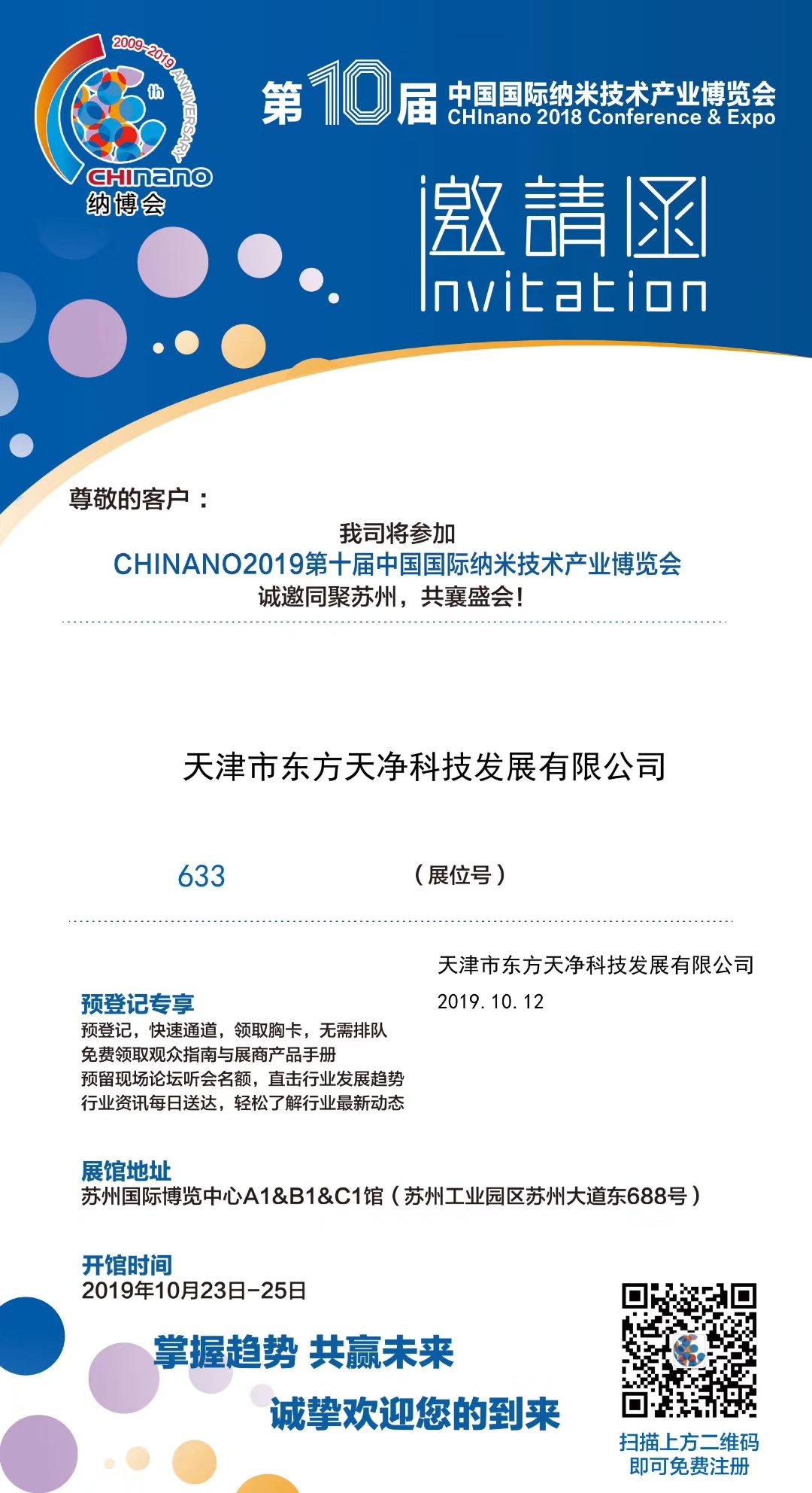 第十届中国国际纳米技术产业博览会'/span>The 10thCHInano Conference & Expo----CHInano 2019)将亍/span>2019平/span>10朇/span>23-25日在苏州国际博览中心隆重举办。天津市东方天净科技发展有限公司诚邀同聚苏州,共襄盛会!