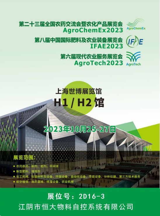 由中国农药工业协会主办的“第二十三届全国农药交流会暨2023国际农化产品展览会”将于2023年10月24~27日在上海浦东喜来登由由酒店和上海世博展览馆举行。江阴市恒大物料自控系统有限公司作为粉体自控解决方案供应商将携多款产品亮相。