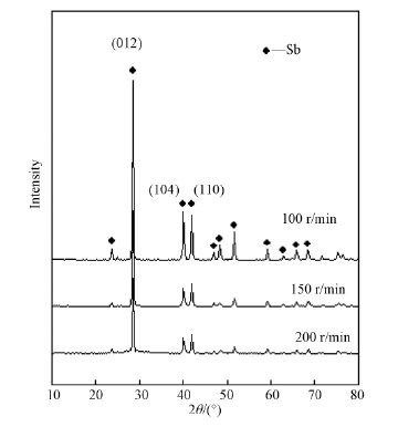 上图 100?50?00 r/min 转速下分别球磨 18 h后所得锑粉的 X 射线衍射谱图。由图可看出?50 200 r/min 所 ?00 r / min转速球磨样品的衍射峰有明显宽化现象,表明两种转速下制备的锑颗粒粒径尺寸 100 r/min转速下制备的锑颗粒更小、/span>