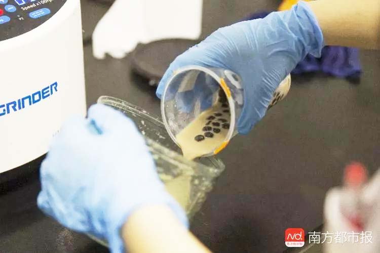 负责本次检验的广东省食品检验所工程师介绍,要检测奶茶中的成分含量,必须进行样本前处理,首先把奶茶倒入研磨仪,使奶茶和珍珠搅碎、充分混合均匀,方便取样检测,结果也更加严谨科学、/p>