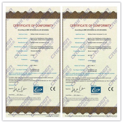 近日,我公司几个旗舰产品先后获得欧盟CE安全认证证书,这充分印证公司一直以来对卓越质量的追求理忴/span>,对客户安全保护的承诺。认证产品包含高能臼式研磨仪MG100和震动球磨仪GT200系列产品+/span>CE证书的获得标志着北京格瑞德曼仪器设备有限公司取得了顺利进入欧盟及欧盟自由贸易协会国家市场的通行证,为公司海外市场的开拓奠定了基础、/span>