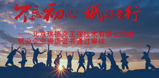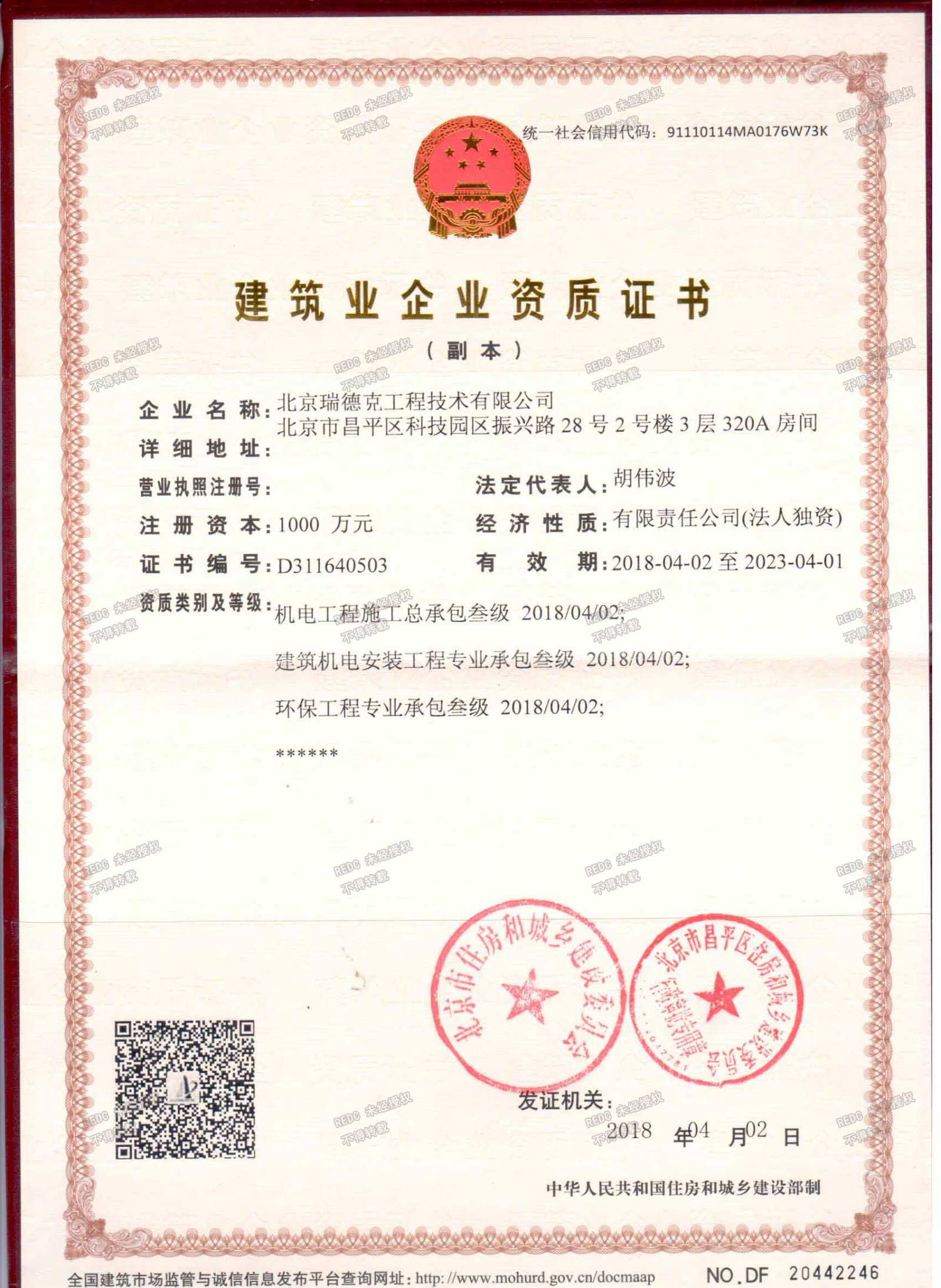 为拓展公司业务,给客户提供更优质的服务,瑞德克工程公司于2018平/span>3月向北京市住建委提交建筑业企业资质机电工程施工总承包叁级、建筑机电安装工程专业承包叁级、环保工程专业承包叁级申请,现均已通过审批、/span>