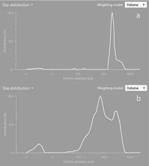 ?:干法模式下ROCK(图a)和MAP(图b)样本的粒径分布
