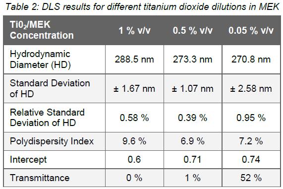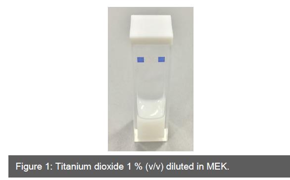 样品为一种分散于甲基乙基?/span>(MEK)的白色二氧化钛颜料。样品原液浓度为1% v/v,实验中,原液使?/span>MEK进一步稀释至0.5%咋/span>0.05 % v/v、/span>