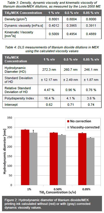 两组数据结果非常相似。浓度最低的样品差异最大,其未校正值为271 nm,黏度校正值为246 nm,而这一差值不?0%。但需要注意的是,不同稀释度油墨样品之间的黏度差异不?%(?),这说明黏度的微小变化会对粒径产生成倍的影响、/span>