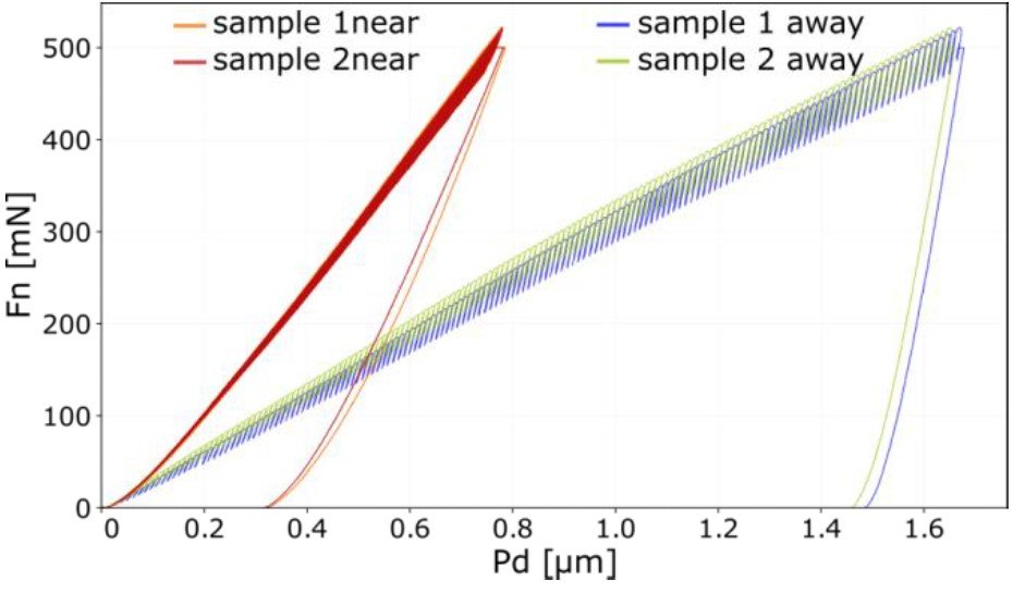 使用Anton-Paar纳米压痕仪NHT3搭载半径?0 µm球型针尖对两个已经存在焊缝裂纹的样品进行测试,以获得局部的应力应变行为;与传统的静态测试方法不同的是,在这次的应用案例中将采用在加载过程增加正弦波加载方式的动态测试方 (Sinus),选取最大载荷为500 mN,加载卸载速率?000 mN/min,动态加载振幅为50 mN,频率为5 Hz、/p>