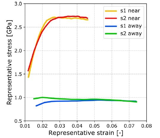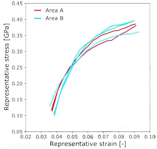 两个区域表现出相类似的弹塑性行为,屈服应力约为0.3 GPa。这表明焊接过程中加热和冷却对材料的弹塑性性能的影响可以忽略不计。然而,并非所有情况下都是如此,焊接区域的局部应力应变行为仍然是优化焊接参数的重要信息、/p>