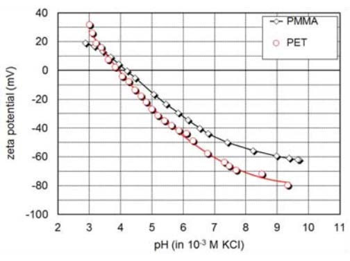 随着pH降低,惰性聚合物表面如聚甲基丙烯酸甲酯PMMA和聚对苯二甲酸乙二酯PET的负的zeta电位减小并且零电位点IEP在pH 4处、/p>