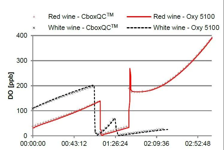 国/span> 2 显示了在不同 CO2 浓度下,含气葡萄酒的工艺和实验室数据相关性。在使用 N2 脱气的过程中,Carbo 5100 与实验室参考 (CboxQCTM) 之间的偏差(< 11:45 的时候)是由于溶 N2 含量相对较高造成的。实验室参考值和 Carbo 6300 的测量方法均不受溶解外来气体(如 O2 N2)的影响。图 3 显示了红葡萄酒和白葡萄酒 DO 的工艺和实验室数据相关性、/span>