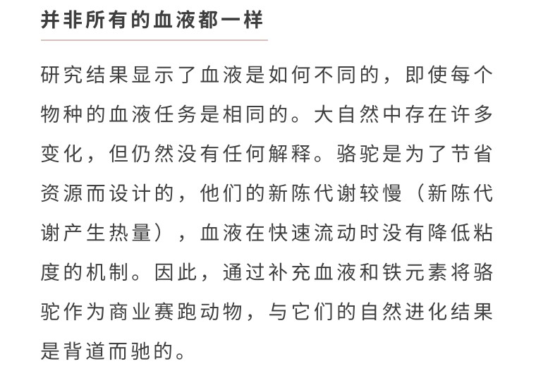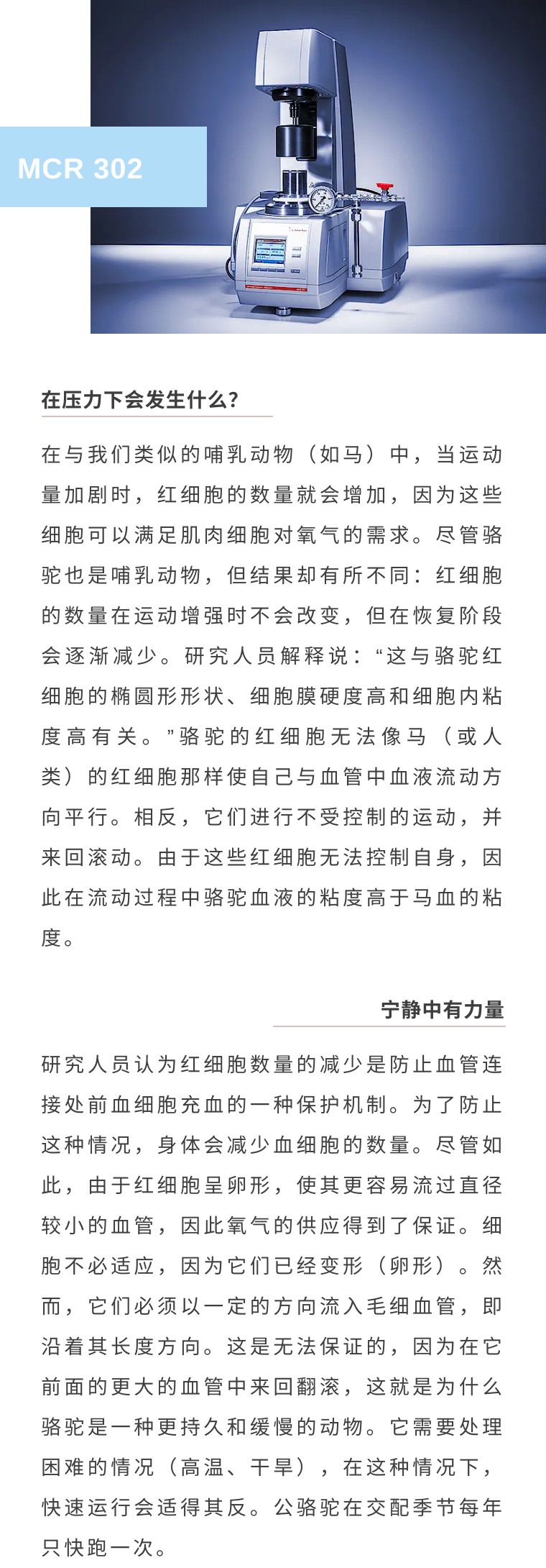 乌苏拉·温德伯格(Ursula Windberger)是维也纳医科大学的实验外科教授,确切地说在血液方面有深入研究。她与她的研究小组一起,使用安东帕(Anton Paar)的MCR 302流变仪,研究了迪拜骆驼繁殖场的十只单峰骆驼和维也纳的十匹纯种马的血液。她取得了惊人的结果,并发现了有趣的差异、/p>