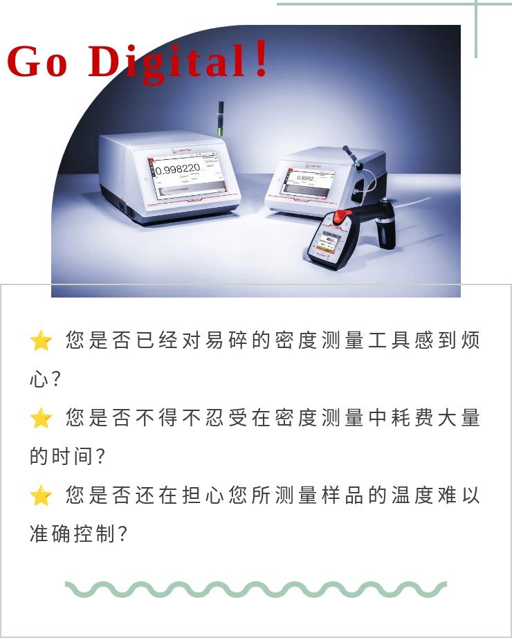 解放您的双手,让DMA 501/1001独立完成准确的密度测量工作!无论是快速恒温与全范围黏度修正,还是自动化进样检测,亦或是常见的密度浓度换算,这台紧凑式数字密度计带给您的便利远超您的想象!