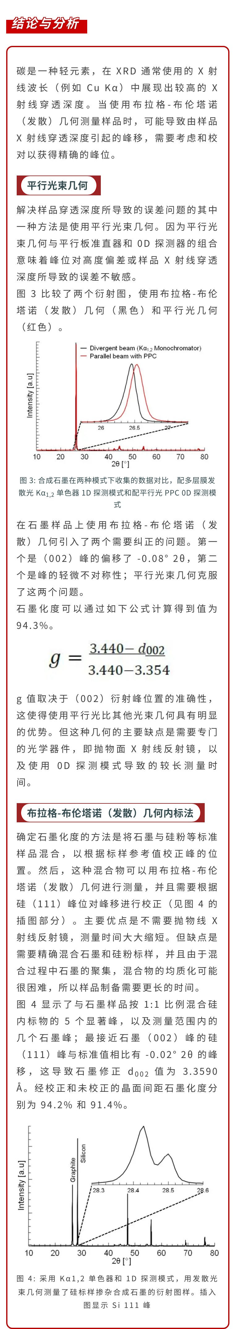 石墨化度影响石墨的化学和物理性能,例如在锂离子电池中用作负极材料时。本文探讨用 X 射线粉末衍射法测定石墨化度的两种方法。第一种方法使用平行光束几何来解决和克服由样品 X 射线穿透深度引起的峰偏移,第二种方法在混合了内部标样的石墨样品上使用更传统的布拉格-布伦塔诺(发散)几何?nbsp;
