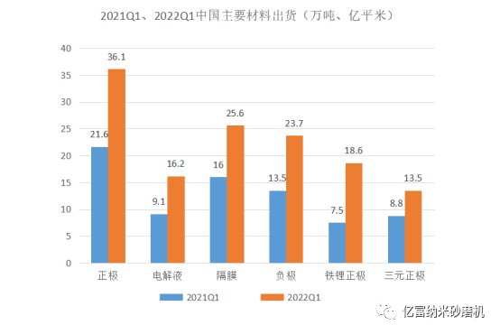 2022年Q1全球新能源汽车销量约197.4万辆,同比增?5%,动力电池装机量?4.16GWh,同比增?08%。其中磷酸铁锂电池占?5%,三元动力电池占?5%。在动力电池出货量提升的带动下,电池关键材料一季度出货量同比增长都?0%以上、/p>