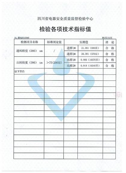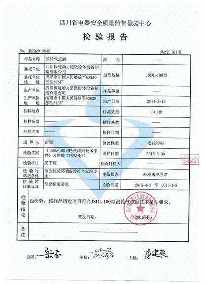 2015??日到2015??日,我市质检所对我公司最新改造的涡轮气流磨进行了历时一周,针对耗能耗电、生产粒度、生产产量等技术的专业检测。检测物料为“稀土”,检测结果为:我公司JSDLQLM系列设备运行平稳,能够达到节能降耗的效果;同时粉尘污染极小,生产粒径D90=16340目 D99=12000目,在更低耗能的基础上达到纳米级效果?br/> 我公司领导也表示:我们一定坚持科技创新,为超微粉碎行业创造出更大价值!